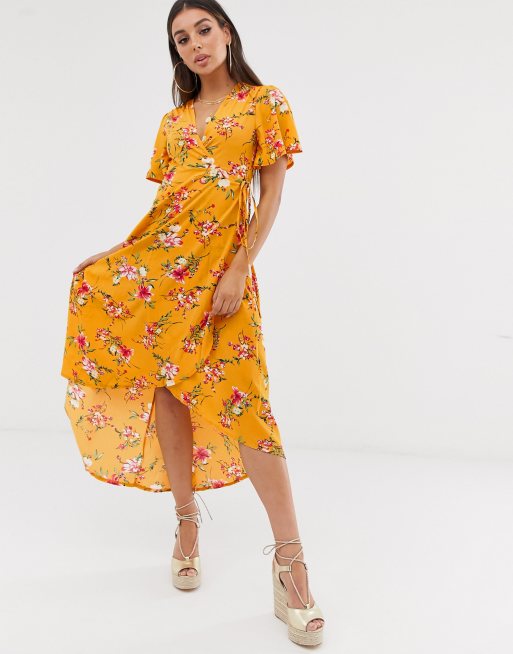 Missguided Wrap Midi Dress In Yellow Floral Asos